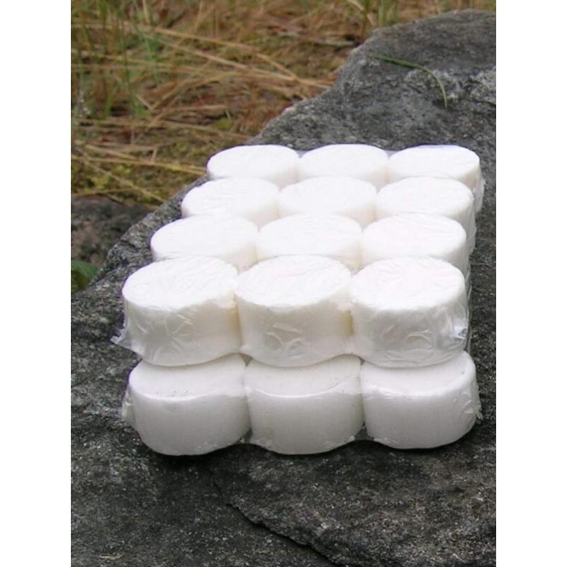 24 Brenseltabeletter som er supre tennbrikkett lignende runde tabletter. De fungerer godt til bruk både under bålfyring og ved bruk av brenselstativet fra Eagle Products.